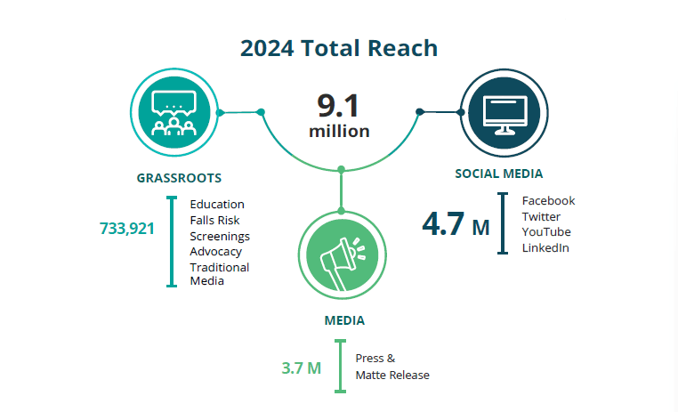 The 12th Annual Falls Prevention Awareness Day engaged organizations in 49 states and reached 300 million people with messages about preventing falls through social media, grass roots education, advocacy, and media. |