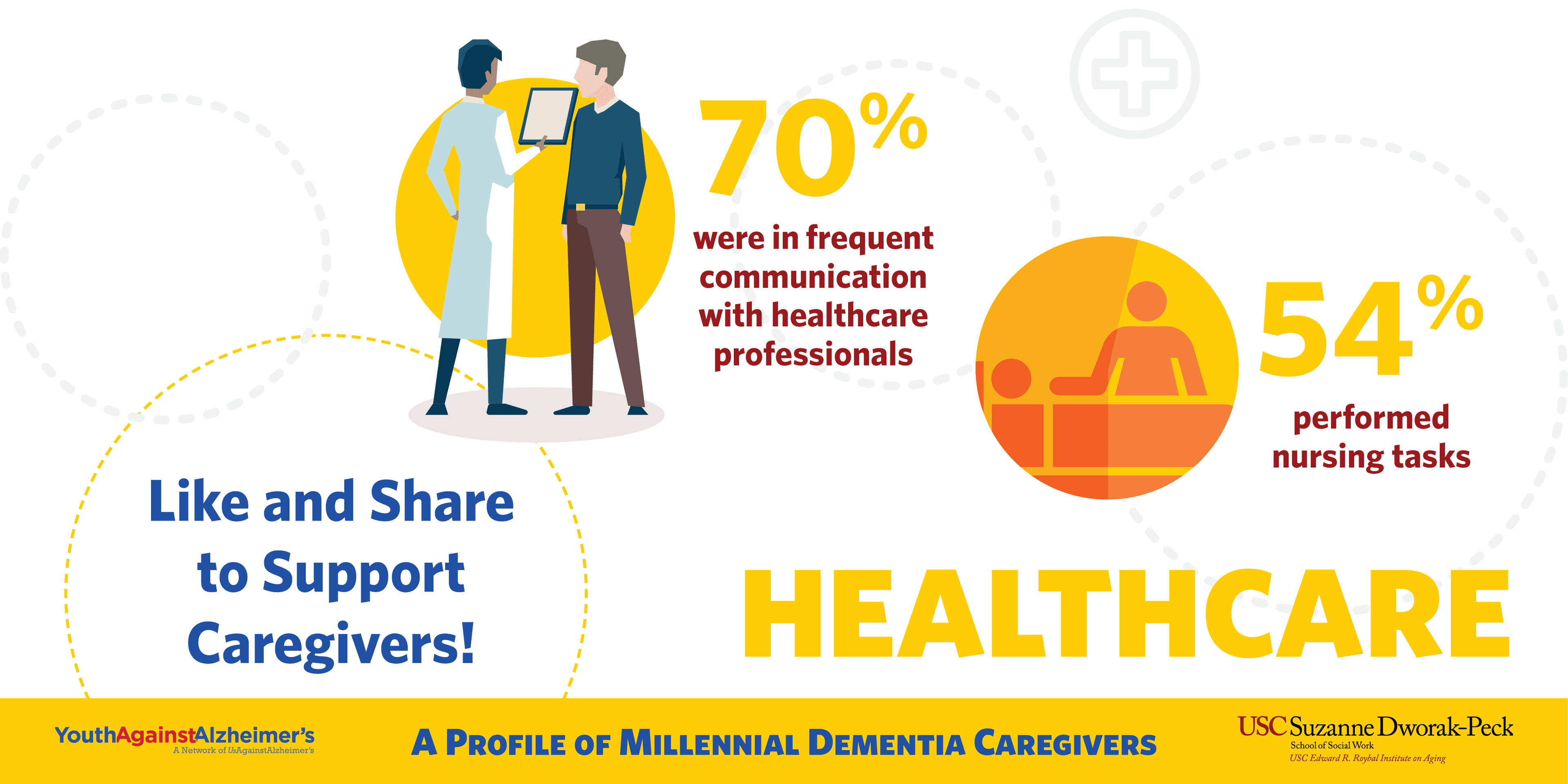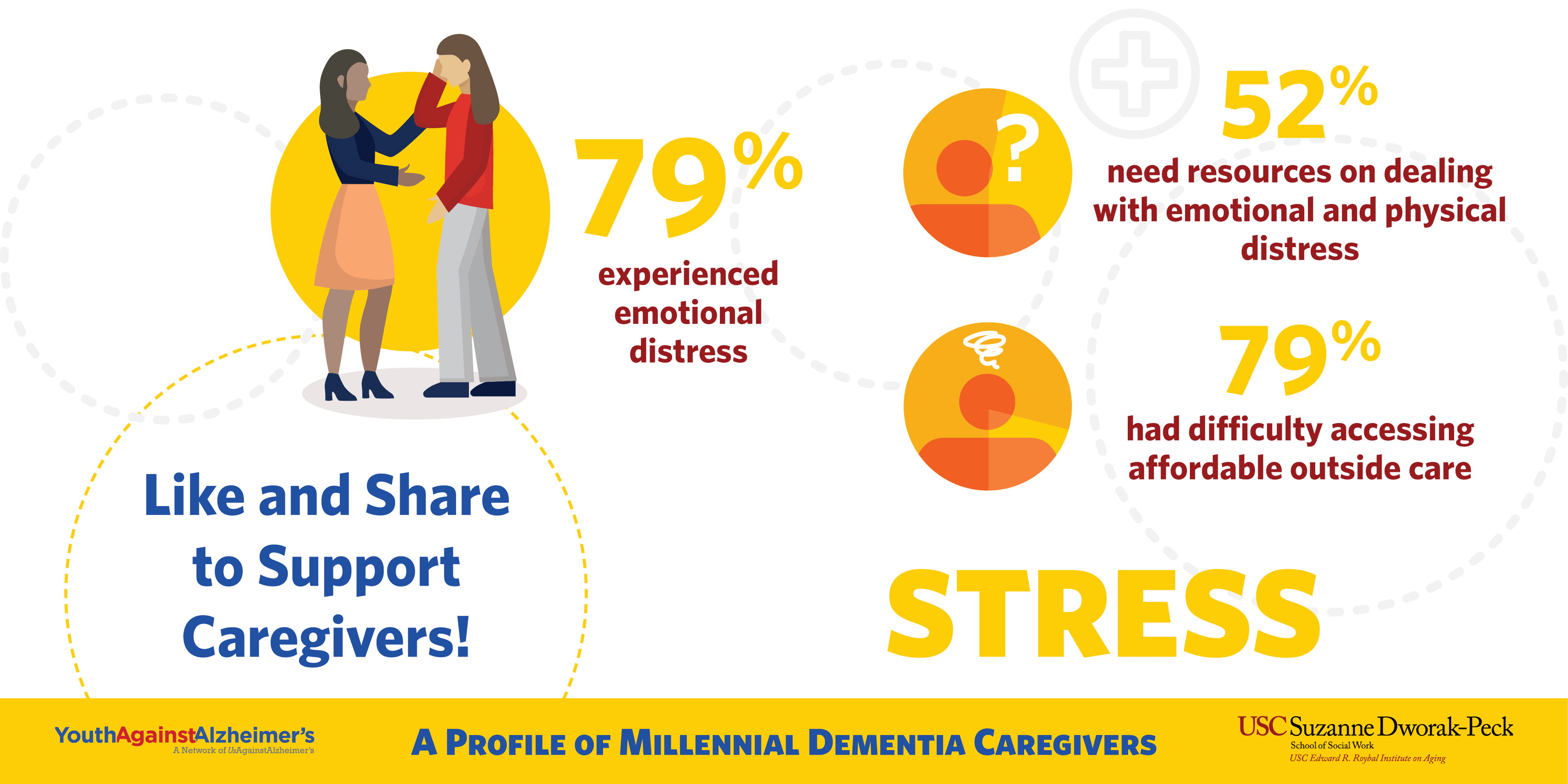 While Alzheimer’s disease is most common among peopled aged 65 and older, its effects are being felt more and more by young people. In fact, one in six millennial caregivers—at an average age of 27—is caring for someone living with Alzheimer’s or another form of dementia, according to a recent report from UsAgainstAlzheimer’s and the USC Roybal Institute on Aging.