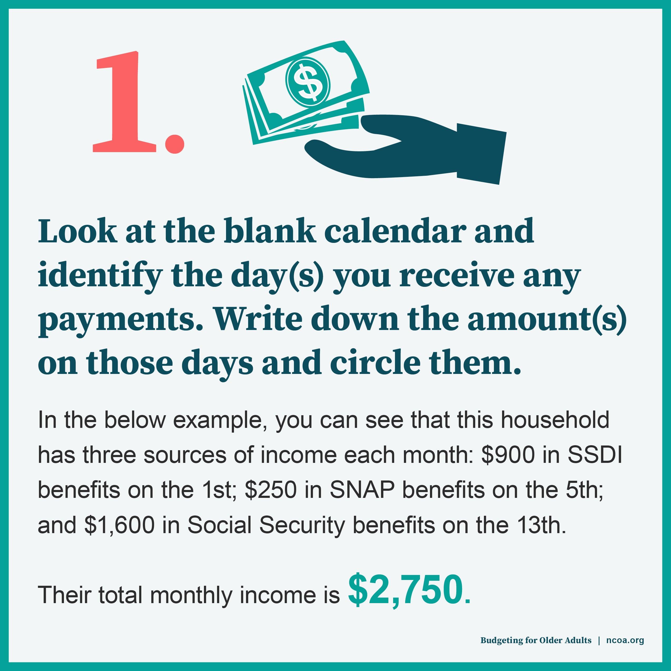 - Your income: Make a list of all the income you receive each month and when. This could include Social Security checks; income from pensions or retirement accounts; and disability benefits or SNAP payments (if you get these).