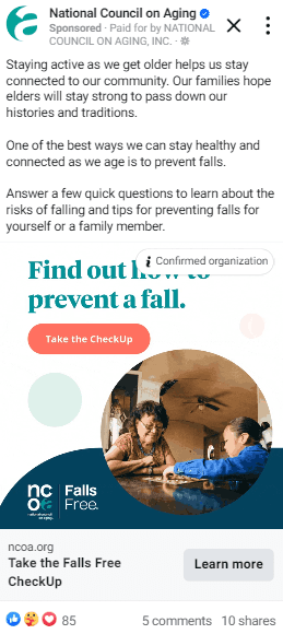 Across all three cities, digital ads that featured a combination of words and images or icons performed best. Short, concise copy was more successful than writing out long messages for social media posts. View one of NCOA’s sample social media posts that tested well: