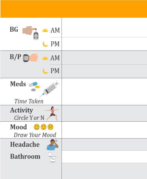 In other sections of the chronic disease self-management tool, an individual will fill out information regarding blood glucose levels, blood pressure, medications, and if they were active throughout the day. There may be sections that do not apply to you or the individual you care for, in which case you can leave them blank.
