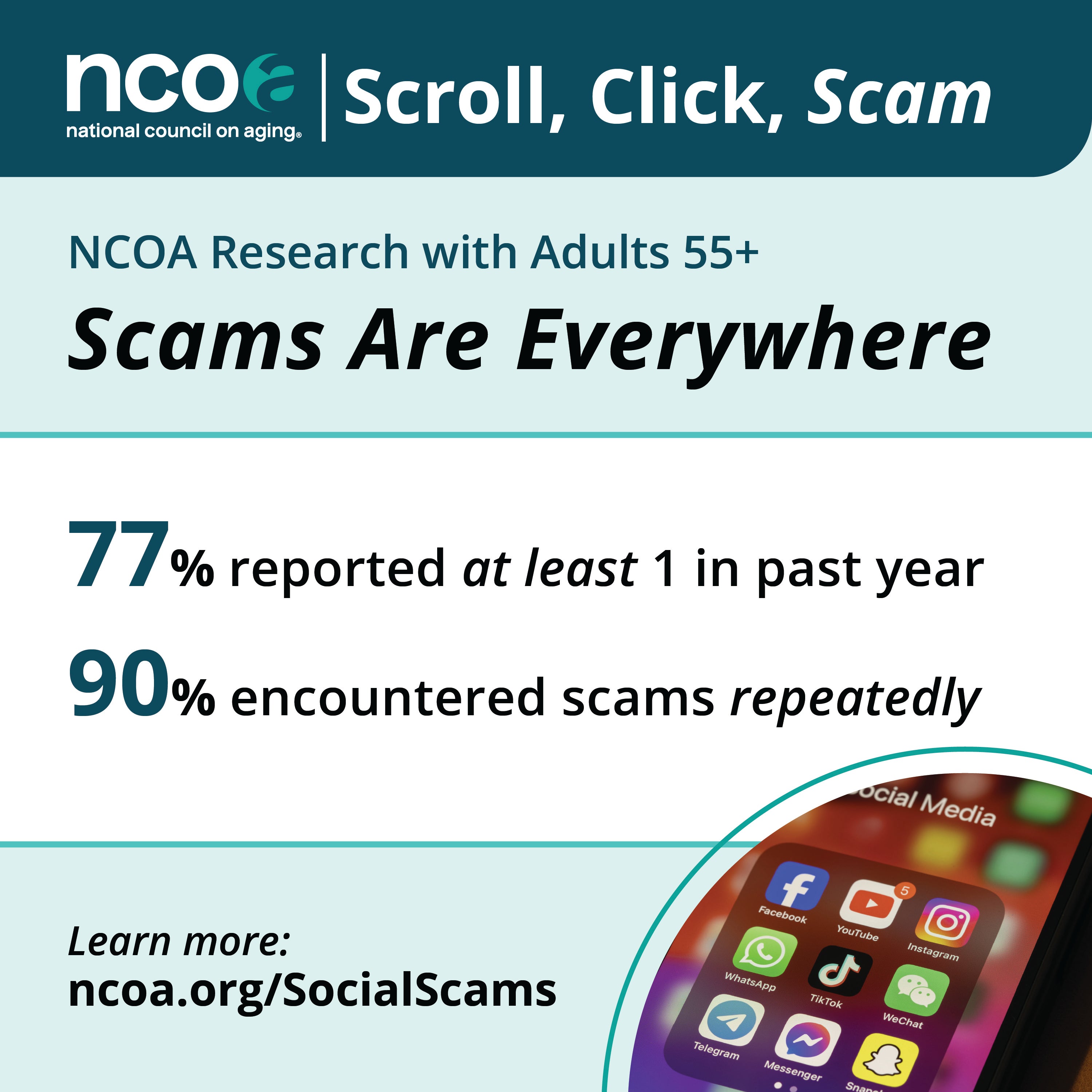 - Social Graphic 1: Scams Are Everywhere, graphic showing that 77% of older adults experienced at least one scam attempt in the past year, and 90% encountered scams repeatedly. Emphasizes how common and persistent online scams have become.
