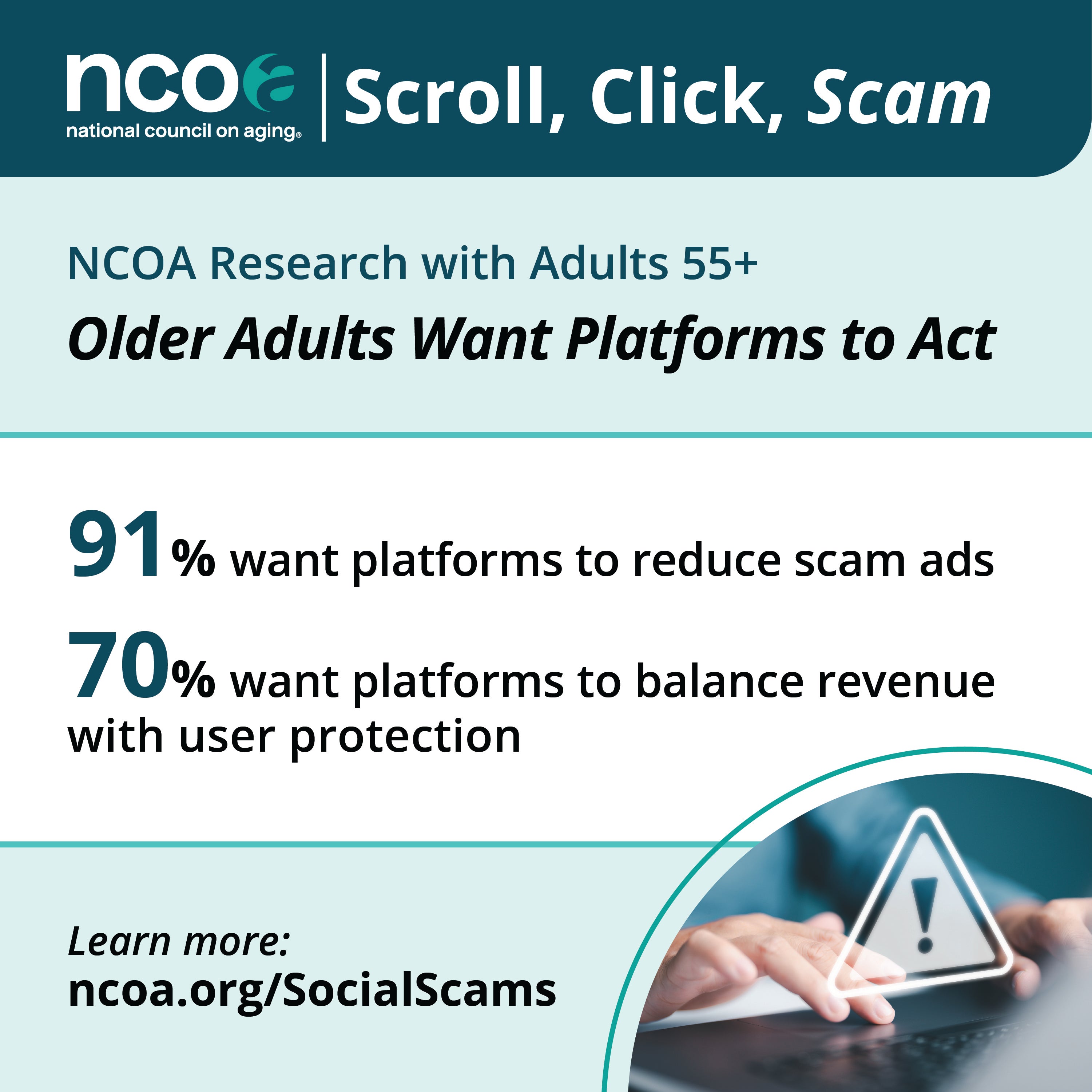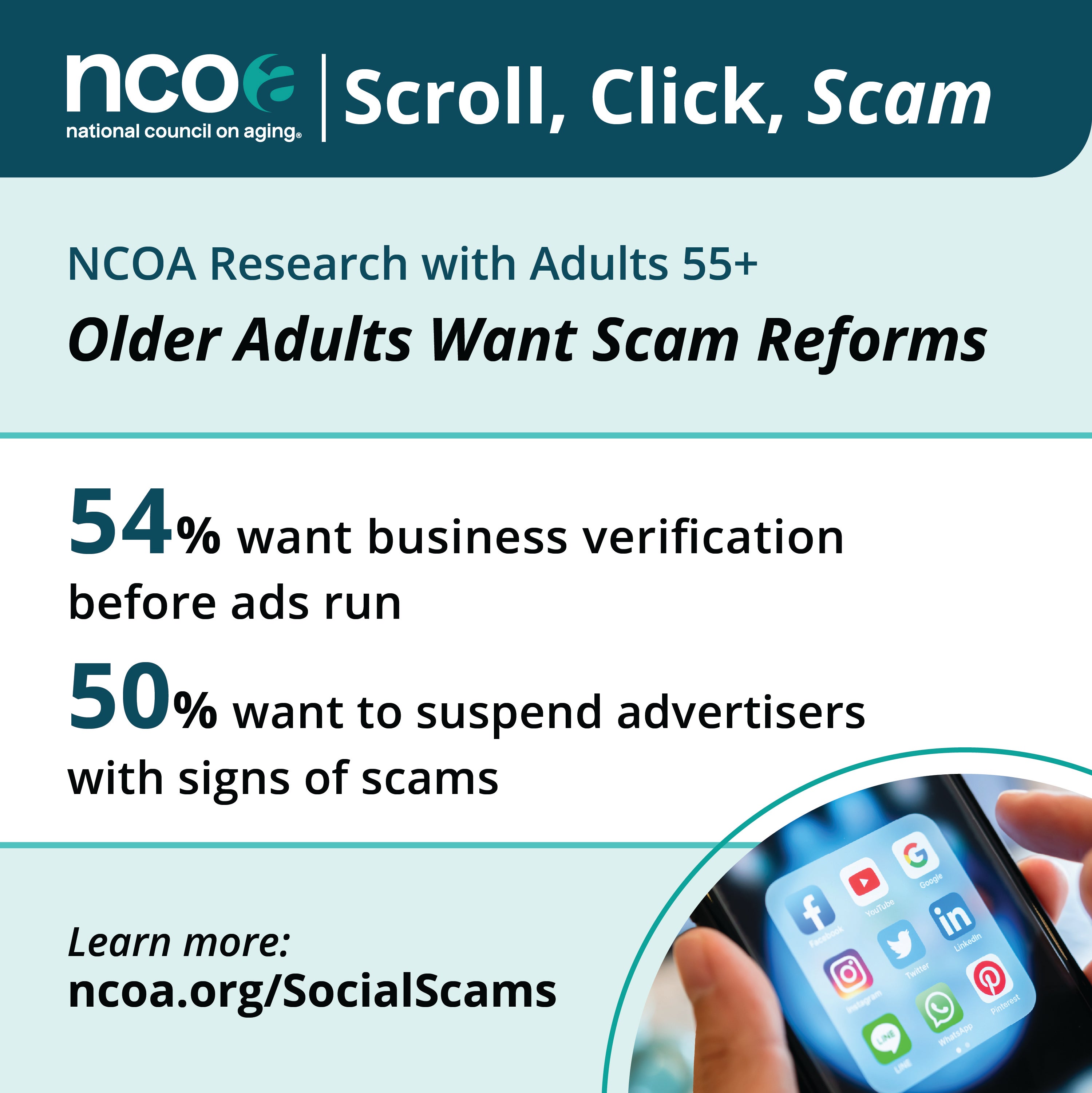 Click below to download NCOA's 'Scroll, Click, Scam: How Social Media Platforms Enable Older Adult Scams' resources: