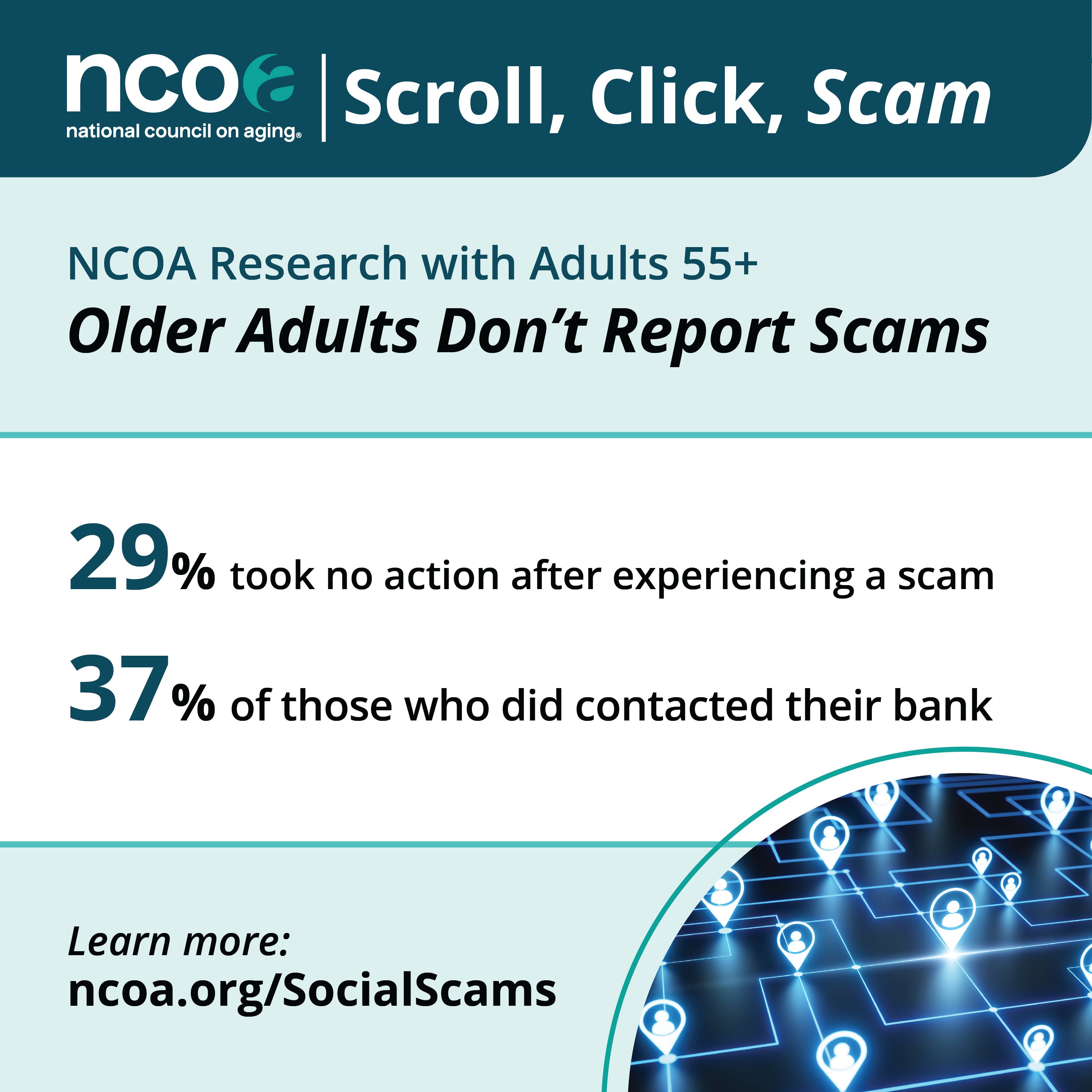 - Social Graphic 4: Older Adults Don’t Report Scams, graphic showing that 29% of older adults took no action after experiencing a scam, while 37% contacted their bank. Highlights how many scams go unreported.