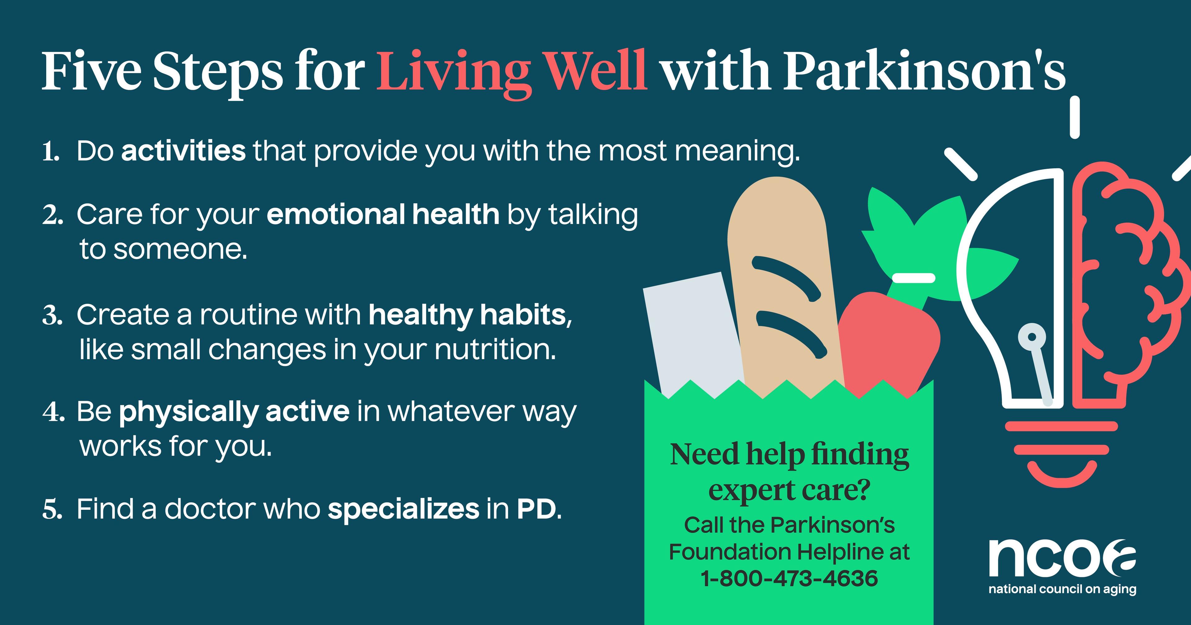 Small changes in your nutrition routine can make a big difference toward living well. The right foods can improve medication delivery, keep energy levels up, and maintain bone strength. Rest is also important to managing life with Parkinson’s. - Be physically active in whatever way works for you.