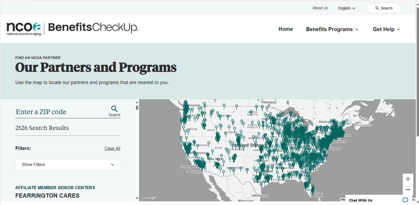 If you would rather talk to someone in person, you can search the new BenefitsCheckUp map. It features our partners who can help you find and enroll in benefits. Just navigate to “Get Help”, select “Local Help,” and enter your ZIP code. You’ll see options available near you and their contact information.