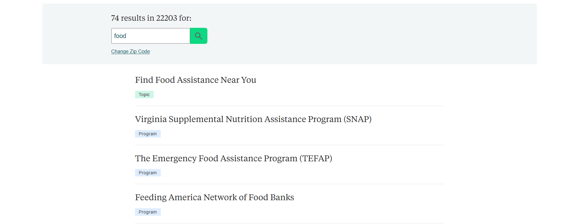 If you already know you want information about a certain topic, you can now search for it along with your ZIP code and find details immediately. Looking for help paying for food? Simply click on the search bar at the top of the screen and enter the word “food” and your ZIP code.