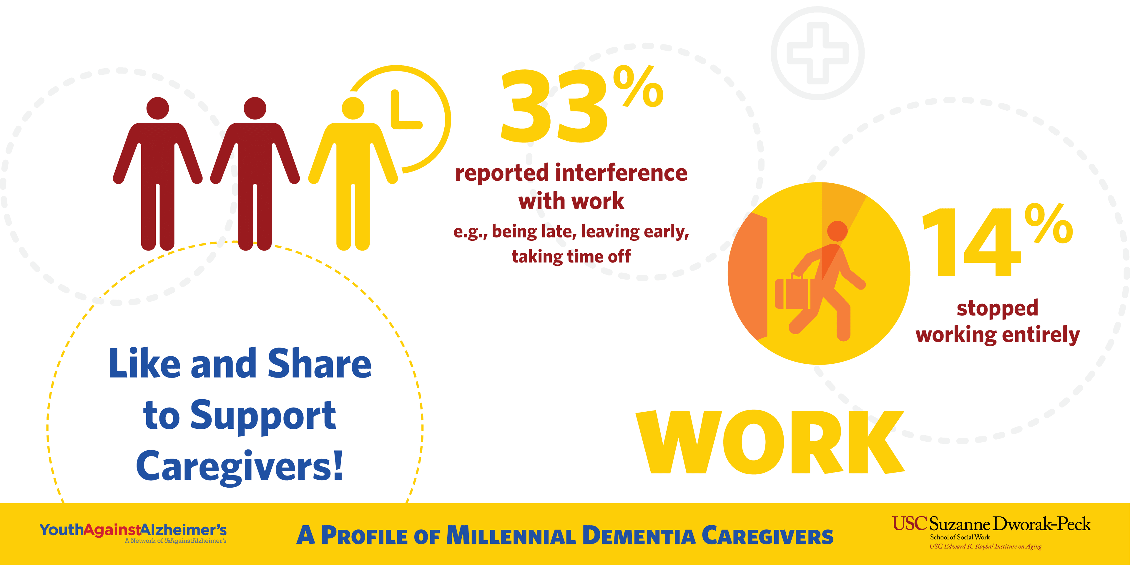 Caregivers often take time off work or work fewer hours, and for millennials, this means doing so at a time when professional growth is critical to earning potential. About 1 in 3 millennial dementia caregivers states that caregiving interferes with work, and 1 in 3 reports severe interference with work (e.g., cutting back hours, losing job benefits, being fired). This economic burden is an acute pain point for caregivers with only a high school education or less.
