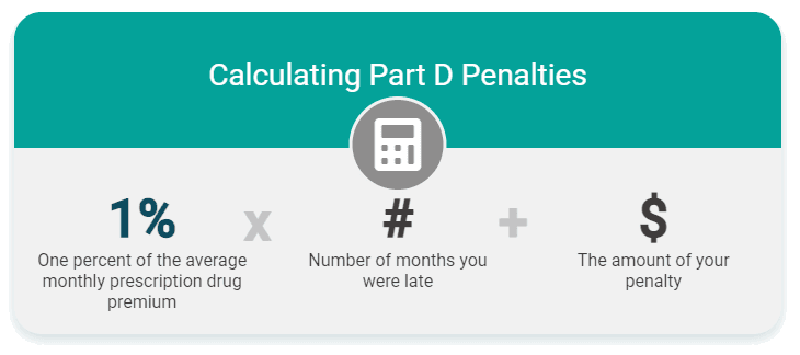 If you go 63 days or more without Medicare drug coverage or other creditable prescription coverage after you're first eligible, you'll face a Part D late enrollment penalty. The penalty is 1% of the national base beneficiary premium ($36.78 in 2025) for each month you delayed. That figure is rounded to the nearest $.10 and added to your monthly Part D premium for as long as you have Part D.
