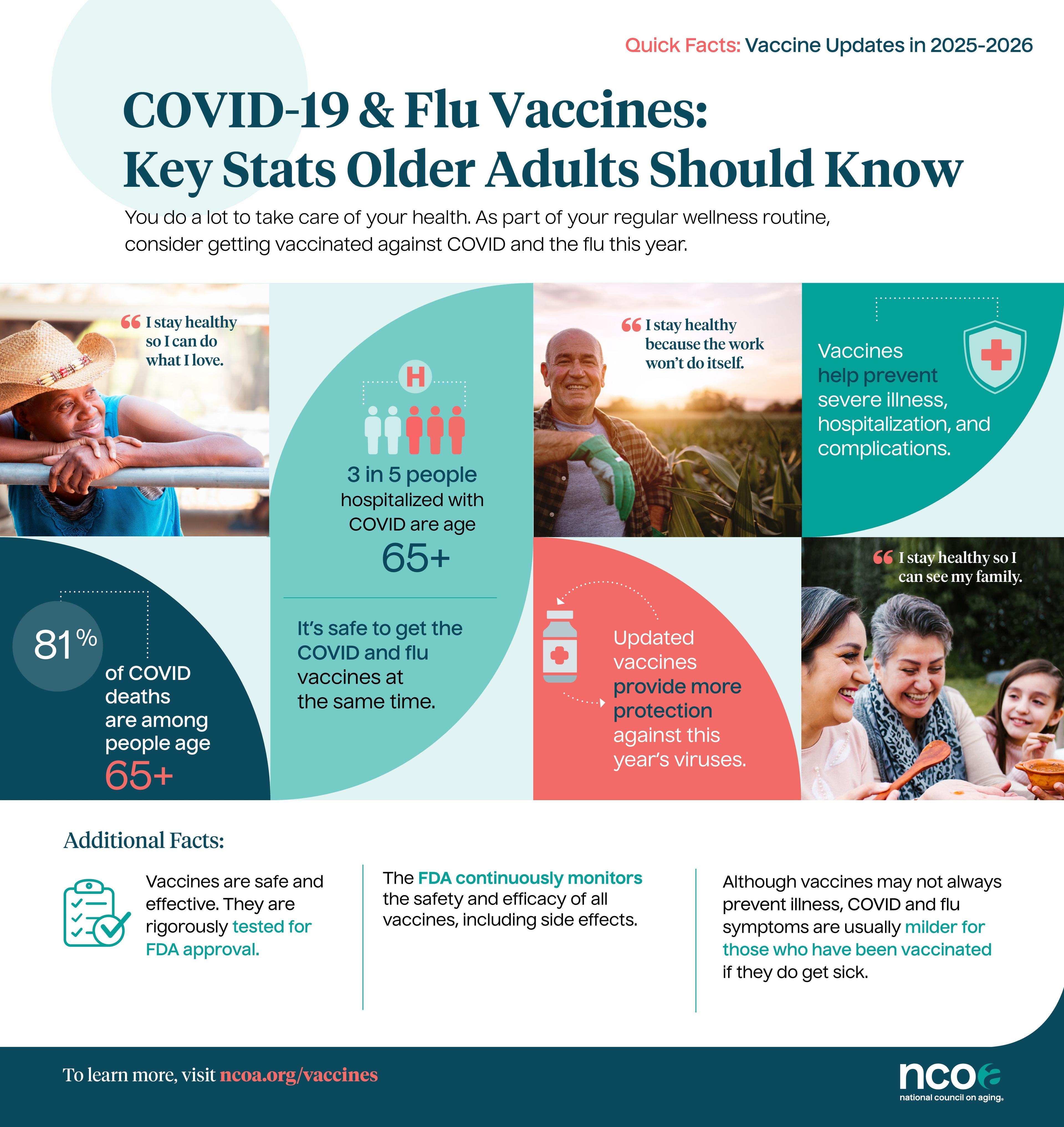 At NCOA, we support evidence-based immunizations to help older adults lower their risk of severe disease, hospitalization, and death while protecting the broader community. We encourage older adults to talk with their doctor, pharmacist, or nurse about their individual health risks and to get the updated 2025-2026 COVID, flu, and RSV vaccines for the best protection.